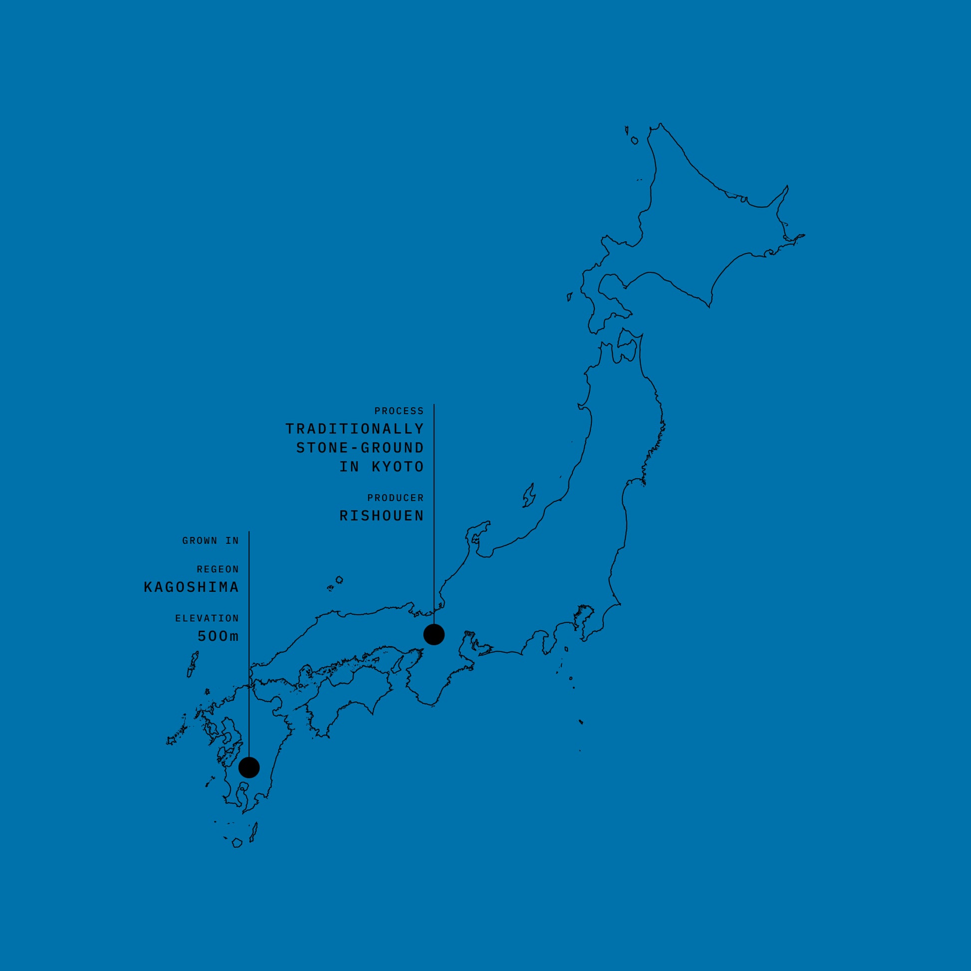This vibrant matcha is born from the tender first flush leaves, hand-harvested from the pristine slopes of the Kirishima volcanic mountain range in Makizono, Kagoshima. For 20 days before harvest, these leaves are carefully shaded, allowing them to develop their signature umami flavor while gently reducing any bitterness. Immediately after harvest, the young, delicate leaves are steamed and dried to lock in their freshness. Once sorted and de-stemmed, they transform into Tencha, the raw material for our velvety jade Matcha.